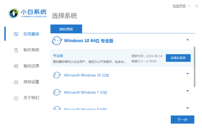步骤一:先下载小白一键重装软件然后打开软件,选择我们需要安装的系统。